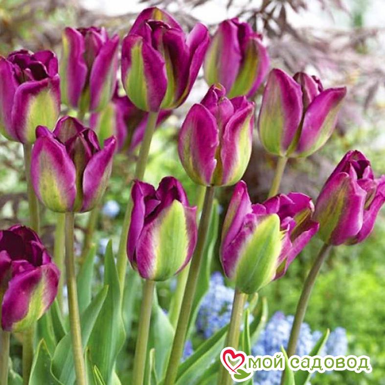 Тюльпан класса люкс.Относится к сорту зеленоцветковых. Экстравагантное сочетание цветов зеленого и фиолетового,очень удачный микс. Бокал крупный,порядка 9 см. В клумбах очень хорошо сочетается с белыми цветами. Высота тюльпана около 50 см.